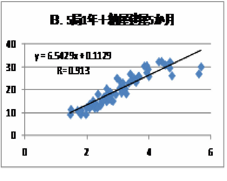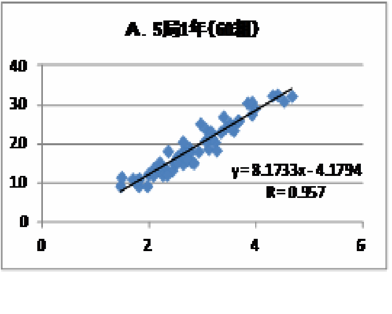 これを見ると四季がそれぞれ隣の季節とは群として気温に差があるので、3か月ずつの各季節に分けてそれらの相関性を検討することとした。秋季;13年10,11月、14年9月、冬季;13年12月、14年1、2月、春季;14年3,4,5月、夏季;14年6,7,8月における各5局15組について相関式を作成し、それぞれC,D,E,F図が得られた。夏季F図の相関式は勾配の値が他の3季節のそれから離れて小さいことが分かる。